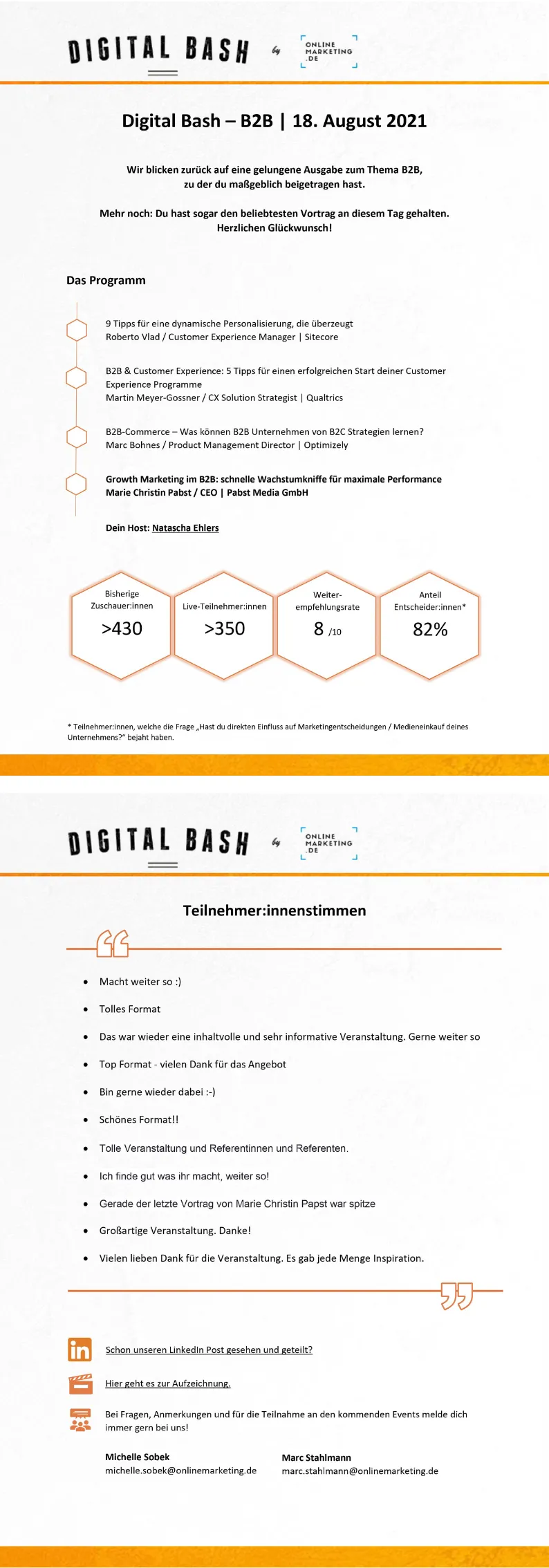 Unter dem Titel “Growth Marketing im B2B: schnelle Wachstumkniffe für maximale Performance” wurde Marie Pabst zur größten Webkonferenz der Digitalbranche eingeladen und überzeugte hunderte Teilnehmer, die den Vortrag von Frau Pabst zum beliebtesten Slot voteten.